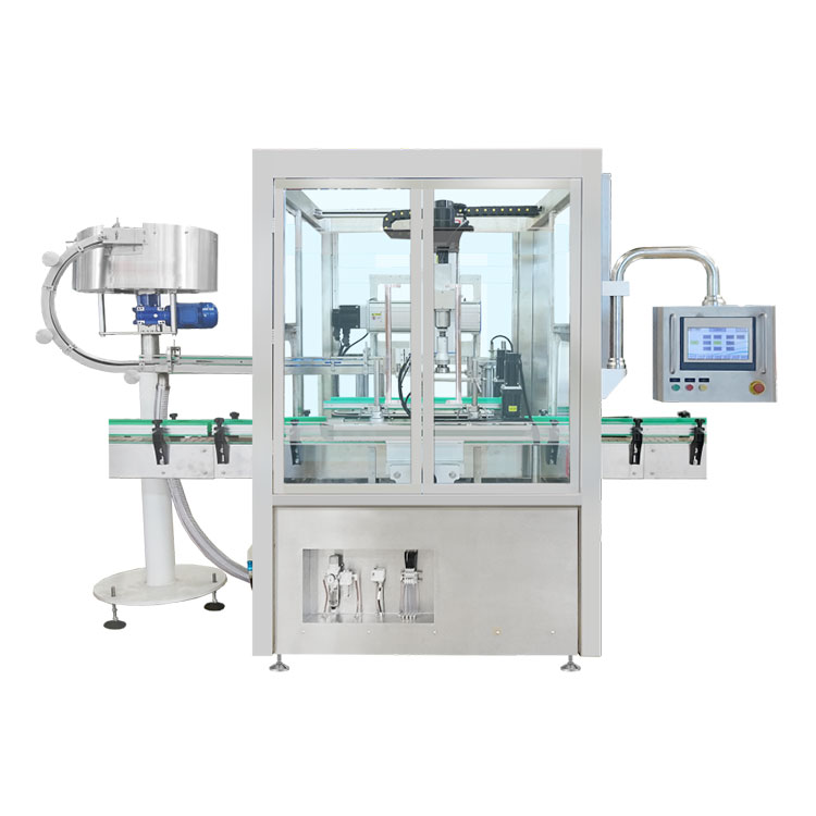 Hastighetene for flaskefôring, lokk, flaskefôring, lokk og lokk kan justeres på berøringsskjermen, unngå fenomenet med flaskehelling og blokkering på grunn av ukoordinerte hastigheter, og forbedre arbeidseffektiviteten; materialet til flaskeklemming med flaskedel er fleksibelt, egnet for de fleste formene på beholderne, og eliminerer fenomenet med skade og skade på flaskene; den høyytelses og pålitelige mekaniske dekselanordningen sørger for at hetten føres inn i hetten jevnt, mykt og uten riper, og sørger for nøyaktigheten av hettens plassering.
